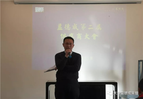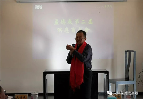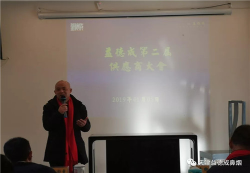 益德成采购中心负责人公司常务副总经理张松贞进行了《用质量铸就百年益德成品牌》的概述,从公司架构和采购流程、鼻烟壶的检验标准、2018年鼻烟壶出现的问题及鼻烟壶未来的研发方向四个方面进行了阐述,要求各位供应商严格按照公司要求,严把质量关,努力做到人无我有,人有我精,自主研发,自主设计,做有特色,有自己标记,别人模仿不了的精品。